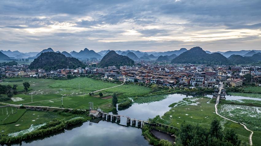 云南省文山壮族苗族自治州丘北县普者黑国度湿地公园气候绚丽,郊外、屯子、河流、群山共同组成一幅祥和的画卷。熊平祥摄