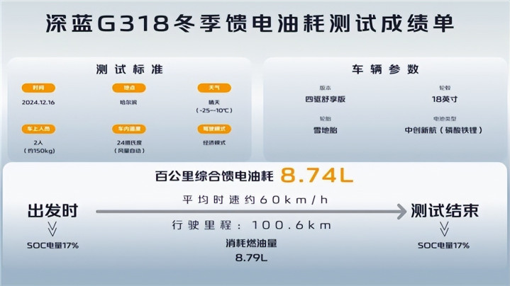 接下来的重头戏,是民众冬季用车最为存眷的续航测试。将从纯电续航和馈电油耗两个方面,来进修深蓝G318的实力。纯电续航测试先将电量充至100%,领受纯电模式、经济模式,空调设定在24℃,风量自动。测试直至发动机自动介入,计较履行行驶里程,并折算纯电续航的达成率。