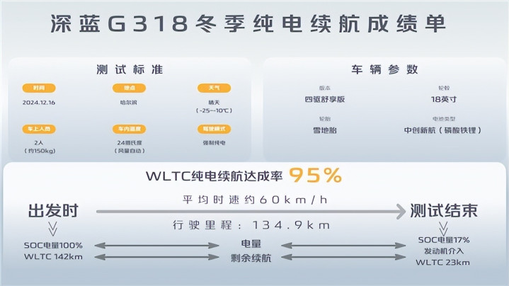 深蓝G318搭载了35.07kWh的大电板,官方宣传WLTC纯电续航达到142km。而为了培植纯电续航,G318全系标配低滚阻轮胎。但接洽到咱们在冰雪路面上行驶,是以换上了雪地胎,这会导致能耗相对偏高。尽管如斯,G318的纯电续航才气仍然令东说念主严防。在雪地模式下,它凭借智慧的四驱系统和高效的电驱总成,在领受纯电、经济模式,空调24°、风量自动的设定下,最终完了了134.9km的纯电续航里程,相较于官方标定的WLTC纯电续航142km,达成率高达95%。在这么的低温下,这个成绩还是跳跃了主流纯电车型的冬季续航达成率,令东说念主诧异不已。