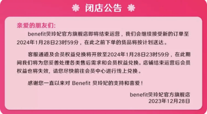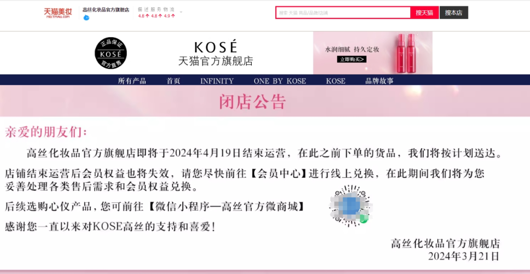 近日,高丝天猫旗舰店发出闭店公告,“行将于2024年4月19日抑制运营,在此之前下单的货色,咱们将按规划投递。店铺抑制运营后会员职权也将失效,请您尽快前去会员中心进行线上兑换。”