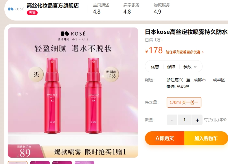 从店铺在售商品看,其原价178元一瓶的定妆喷雾,现在券后89元买一赠一,现在表示已售出超1万单。