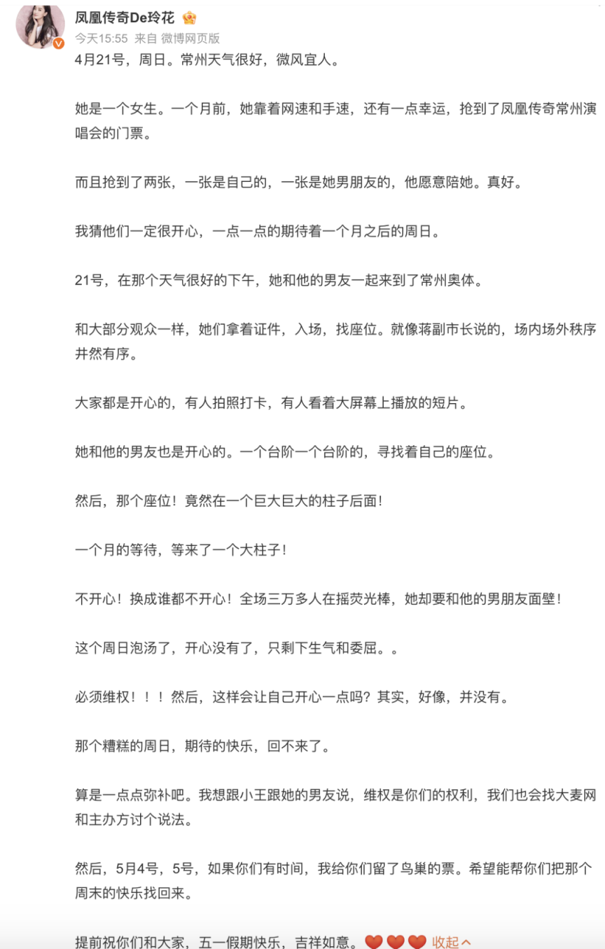 4月20日至21日,凤凰听说“吉利如意”2024巡回演唱会首站在常州奥林匹克体育中心畅通场举行。 有网友发视频称,花960元在大麦网买了两张票,到现场才发现是“柱子票”,不雅看截止欠安,要求平台退款却遭拒。视频泄漏,该网友买到的座位前线是一根水泥柱子,挡住了视野。