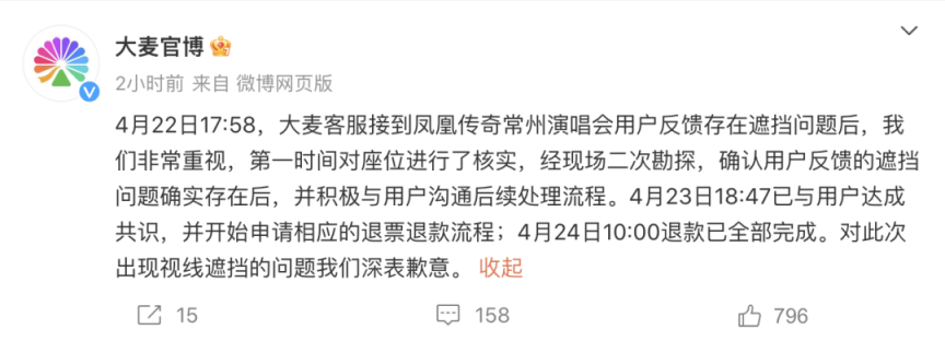 今天15时20分,大麦官方微博发文,就这次出现视野遮拦的问题致歉。