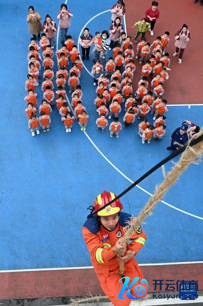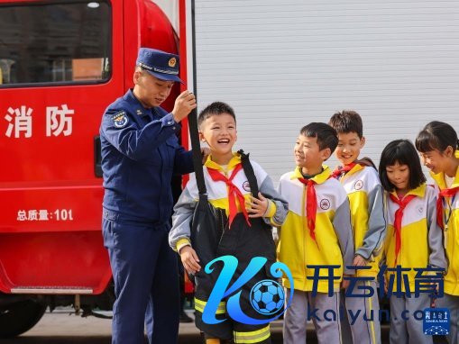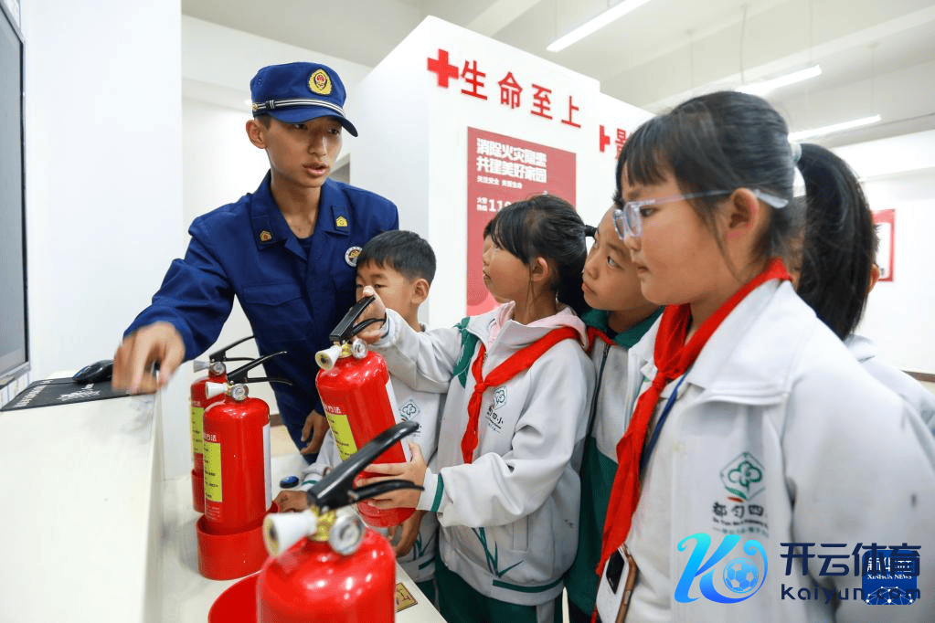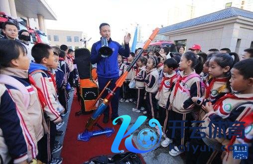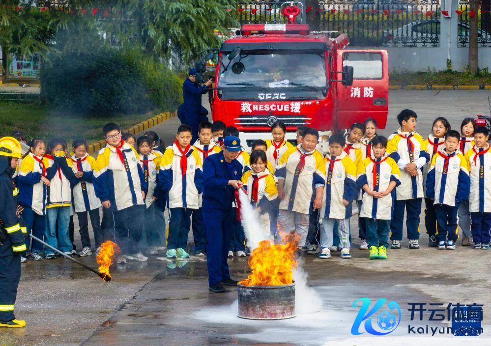 11月8日,贵州省安顺经济本事开发区消防补助大队消防员在安顺黄皆生小学为学生锻真金不怕火展示消防器材(无东谈主机相片)。
