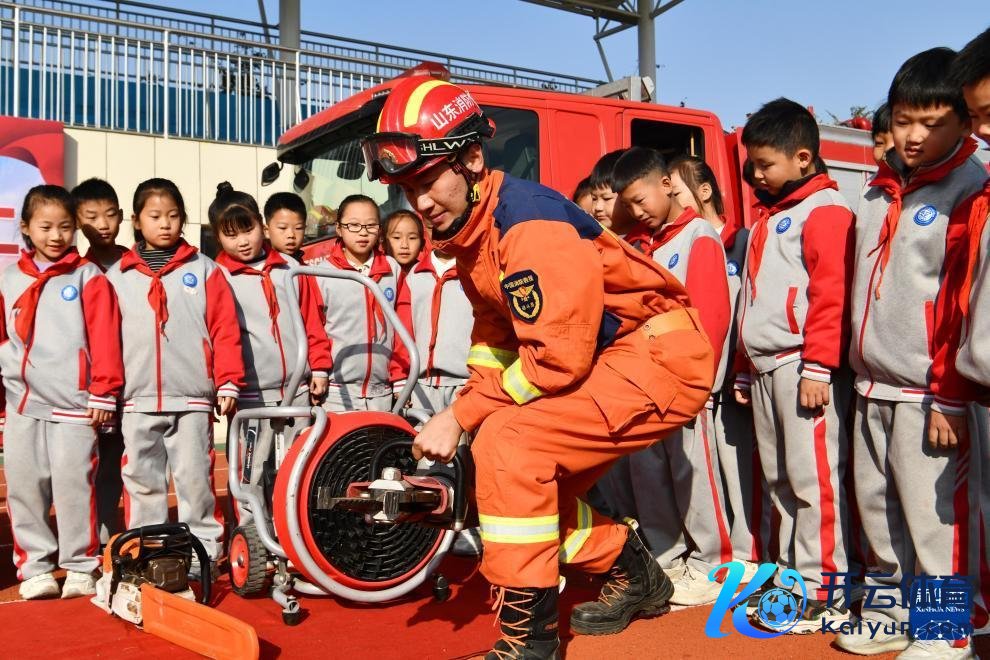 11月7日,在山东省枣庄市台儿庄区兰祺实验小学,消防补助队员向学生们先容消防器材功能。