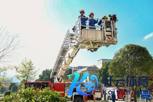 11月8日,浙江省金华市仙源湖实验学校,消防员带着学生体验登高车平台。