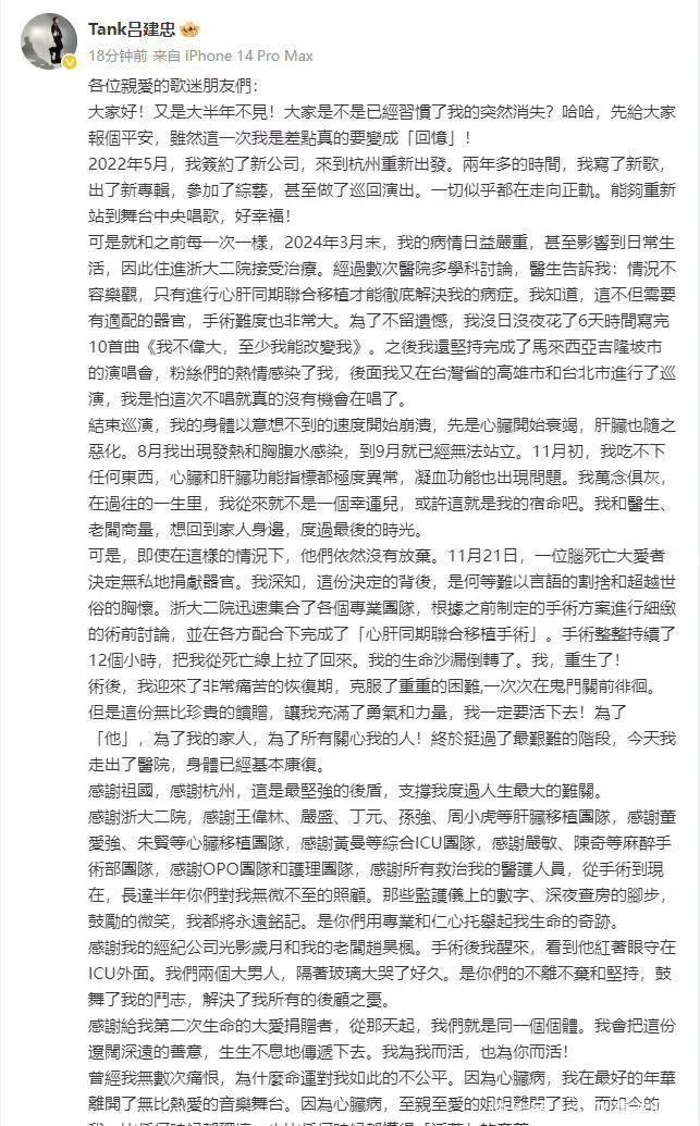 4月7日,一则令东说念主奋斗的讯息在文娱圈传开:照旧因《三国恋》《若是我酿成回忆》等歌曲红遍大江南北的歌手TANK(真名吕建忠),见效吸收了亚洲首例心肝鸠合移植手术,并已康复出院。