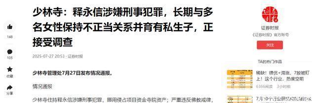 结语 其实咱们众人都知说念,释永信根底就没得洗,也不在于他私德有亏,而是因为他根底上触犯了法律,非论是空门如故俗世,法律眼前东说念主东说念主对等。 少林寺的钟声还会再响,履历磨练的信守能力耐久弥新。 信息来源:证券时报-2025-07-27-《少林寺:释永信涉嫌刑事违纪,恒久与多名女性保抓不正大联系并育有私生子,正采取探询》 个东说念主抖音账号-里夫·马斯克(ElonMusk)-2025-07-31-《品评别东说念主是最容易作念到的,真谛又在那处呢!》