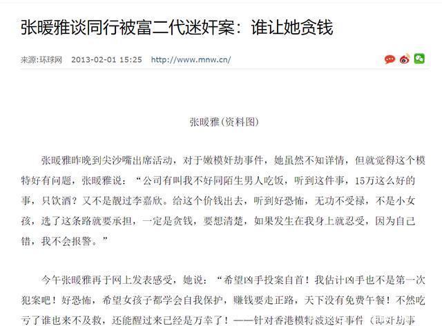 众人网,张暖雅谈同业被富二代迷奸案:谁让她贪钱