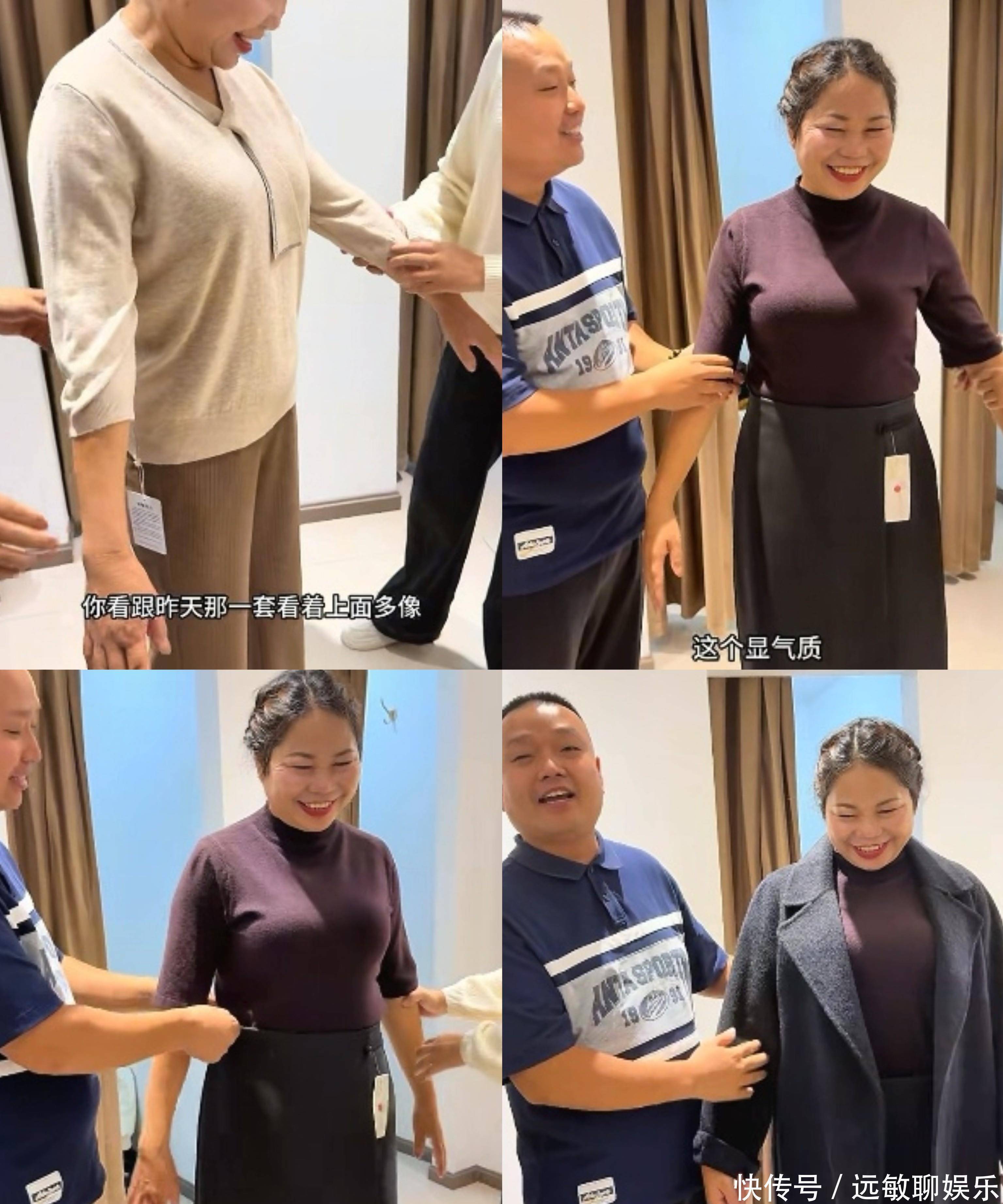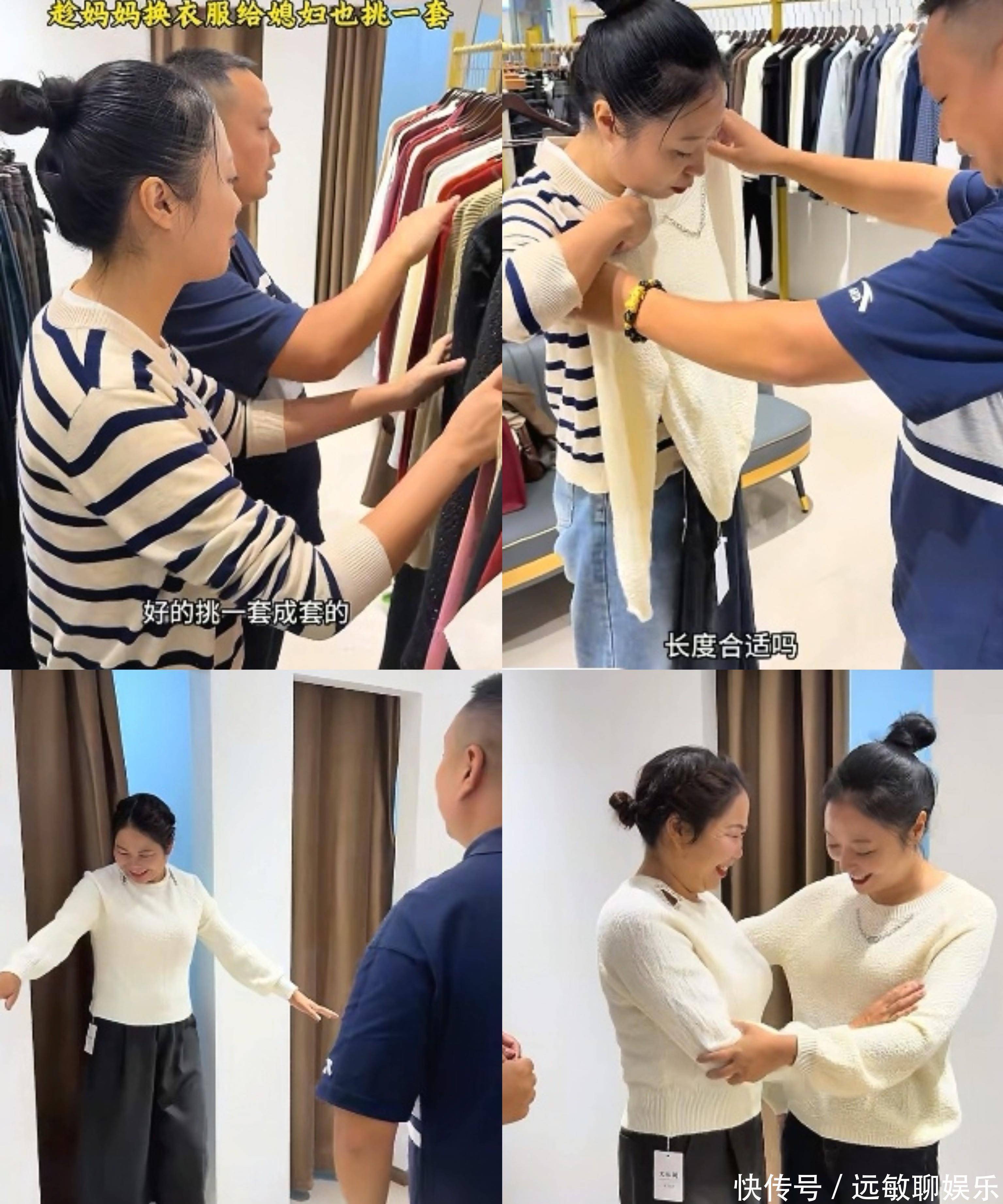 趁姆妈换衣着的阻隔时辰,王晓举给媳妇也挑了一套,没思到婆媳俩穿起来像姐妹装,都很有气质。