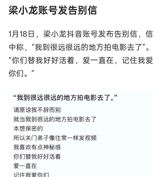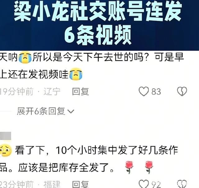 梁小龙的抖音账号还在跋扈发视频,这几天连着发了几十条,全是他生前练功,生涯的片断,账号还发了一条我到很远很远的场所拍电影去了,看着就让东说念主心酸。