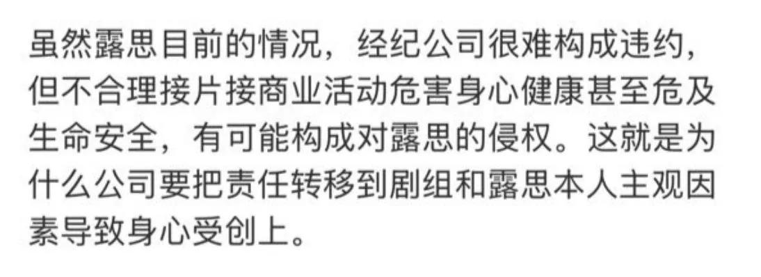 眼看着她的景象如斯糟糕,为什么不暂停她的责任呢?目下粉丝们的响应比拟大,尤其是听到赵露念念的病情,班师发文声讨经纪公司: