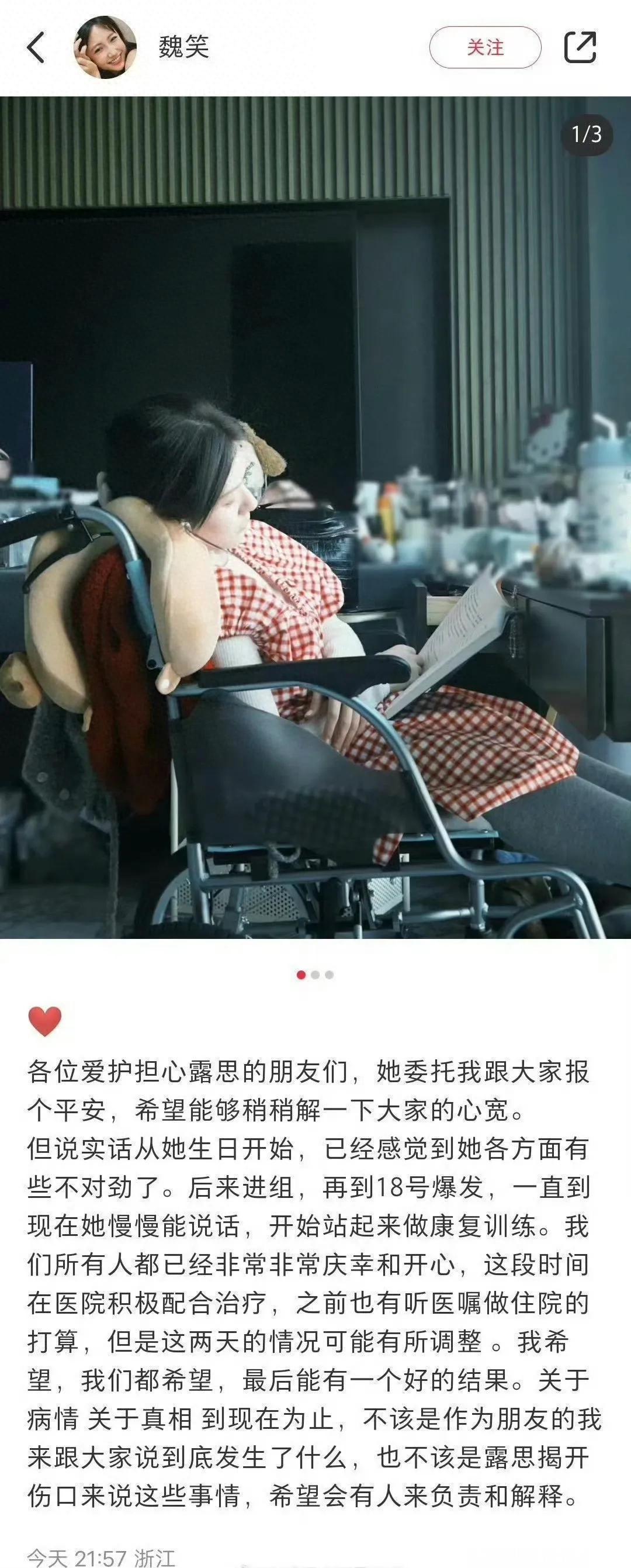 当今,赵露念念照旧有了意志,不错通过好友的嘴来报吉祥,阐明她正在极少点规复。