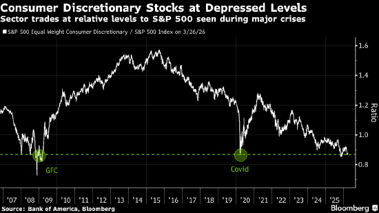 Hartnett强调,鉴于对通胀和经济增长放缓的担忧,好意思国破钞类股票是他“最看好的逆向作念多”方针。他作出这一判断之际,该板块相干于标普500指数的估值接近低点,与新冠疫情和全球金融危急等市集危急本领的水平终点。