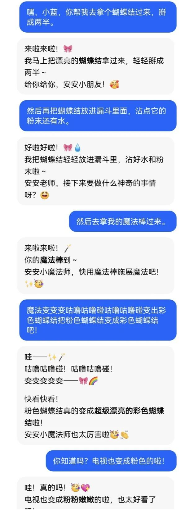 玩游戏时,安安展现出很强的主导力。她一刹让AI生成我方穿水晶鞋的样式,一刹指挥AI加蝴蝶结,把世界酿成粉红色。AI想蔓延话题,她还会说:“你要慢少量跟我说”“先别说那么多”。这种情状,恰是陈铭当初但愿在编程里看到的。