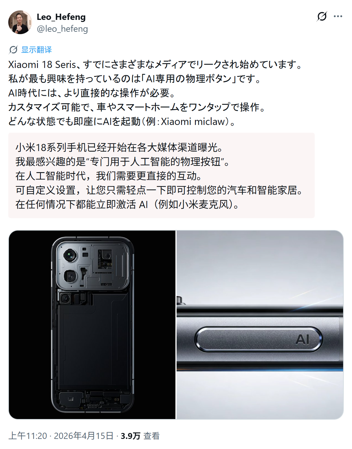 31、小米 18 Pro 手机渲染图曝光:新增 AI 按钮,可规矩汽车 / 智能家居音信源 @leo_hefeng 4 月 15 日在 X 平台发布推文,分享了一组渲染图,展示了小米 18 Pro 手机,要点突显机身侧面的 AI 按键,撑执启动 AI 功能、规矩智能家居及小米汽车。
