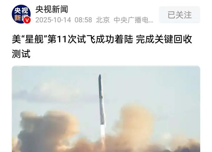 音尘开端:《央视新闻》10月14日报说念《好意思“星舰”第11次试飞见效着陆,完成要津回收测试》