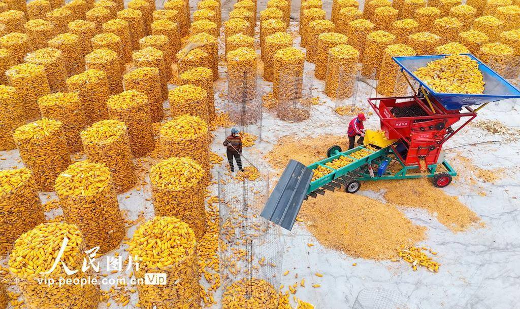 2025年11月7日,山东省滨州市滨城区杨柳雪镇的农民在加工玉米。