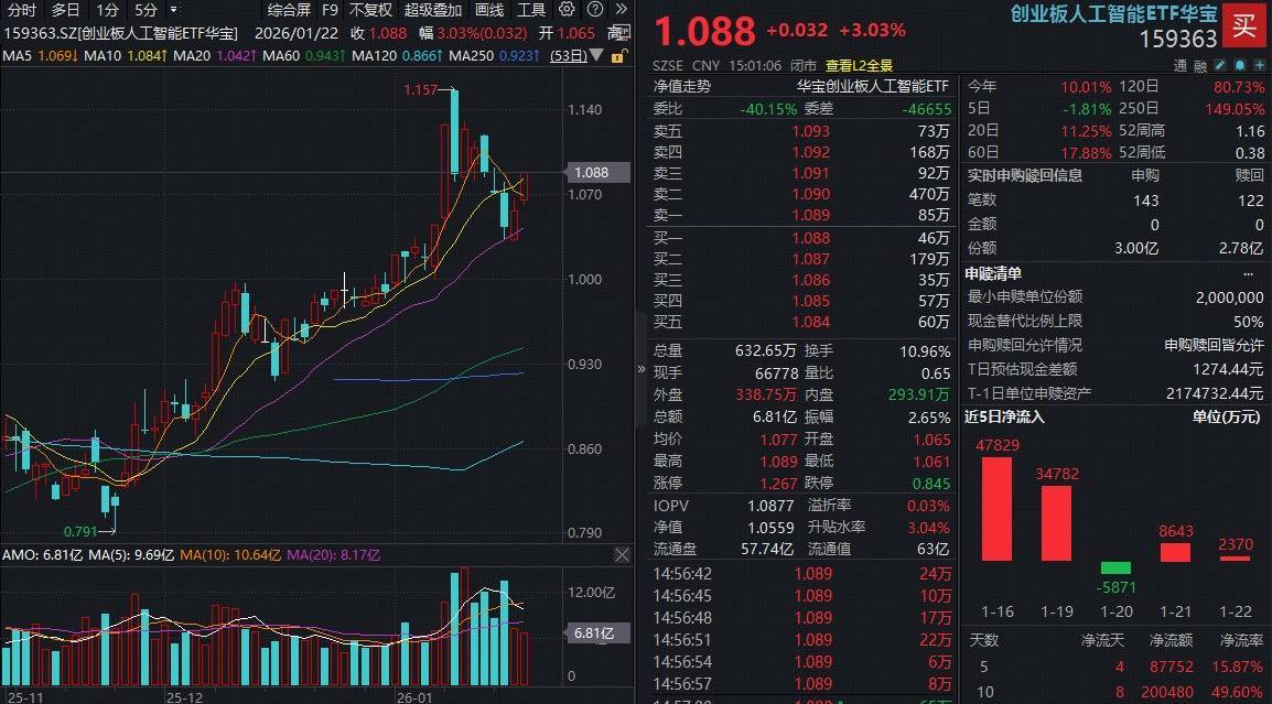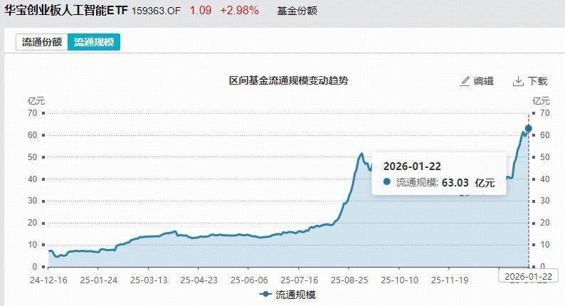 资金抓续醉心,领域再立异高!限制1月22日,创业板东说念主工智能ETF华宝(159363)最新领域达63.03亿元再立异高,近6个月日均成交额超8亿元,领域、成交额在追踪创业板东说念主工智能指数、科创AI指数、科创创业AI指数的25只ETF中高居第一,是双创赛说念领域最大、流动性最好的东说念主工智能ETF!