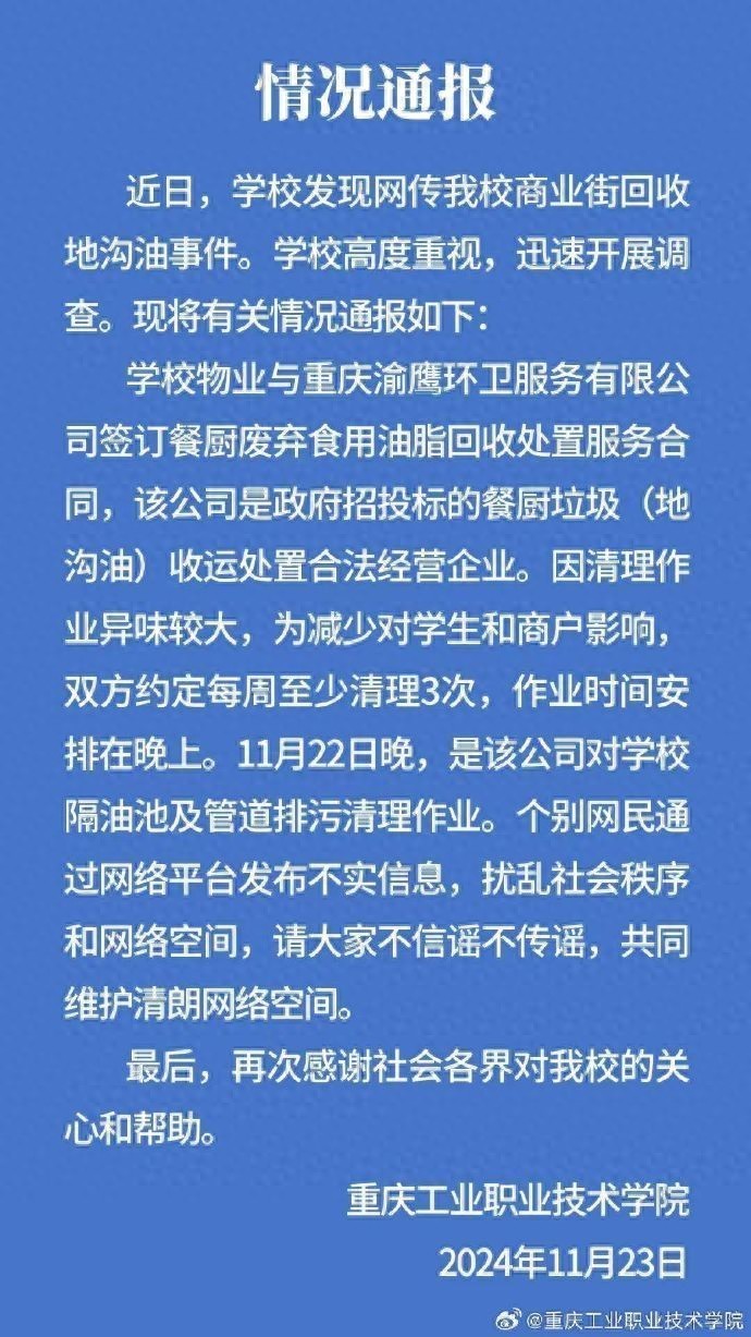央视网音信:重庆工业劳动本领学院11月23日就网传该校买卖街回收土沟油事件发布情况通报称,经查,学校物业与重庆渝鹰环卫办事有限公司矍铄餐厨澌灭食用油脂回收处理办事契约,该公司是政府招投成见餐厨垃圾(土沟油)》收运处理正当沟通企业。